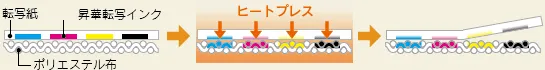 昇華転写インクはプリンタで転写紙にプリント後、高温の転写機に布と一緒に通すことにより、転写紙にプリントされたインクが液体から瞬時に気体となり繊維に染色されます。布自体の風合いを残しながら染料の鮮やかな明るい画像が得られ、耐擦過性や耐水性もあることから、のぼり旗、タペストリー、懸垂幕、Tシャツやユニフォームなど多くの用途で使われるようになってきています。