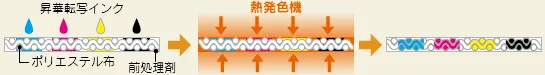 昇華転写インクでプリントされた転写紙に熱を加えるとインクが気化し、密着させたポリエステル布を染色することができます。加熱により、ポリエステルの分子鎖がゆるみ、この隙間に昇華転写インクが定着されます。