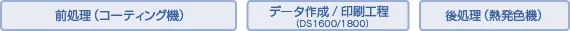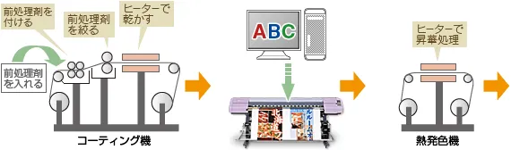 転写紙を使用せず、昇華転写インクで直接プリントが可能な前処理済みのポリエステル布に印刷し、熱を加えて発色させる方式です。前処理を行うコーティング機などの設備投資が必要ですが、転写紙を使用する昇華転写プリントより、ランニングコストを抑えることができます。前処理(コーティング機)設備が必要になる為、通常は、処理済みの原反を仕入れて製作します。