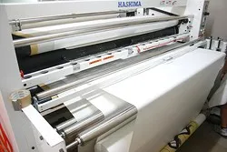 大型プリンターで転写紙にプリント後、200℃まで上がった転写機に布と一緒に通します。転写紙にプリントされた昇華転写のインクは高温で加熱すると固体から瞬時に気化して繊維に染色されます。この事からインクの臭いも残りません。布自体の風合いを残しながら、やわらかな仕上がりになります。
