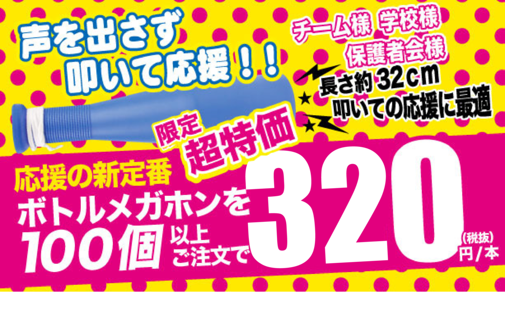 また、様々な種類、カラーバリエーションはもちろん、弊社オリジナルメガホンや、他店では取り扱いが無いような超巨大メガホンをはじめ、名入れステッカーによるオリジナルメガホンの製作や、大量のメガホンを収納可能な収納袋もご用意させていただいております!!!